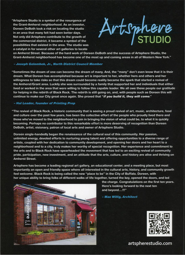 After ten years, Artsphere has become well established and is a desired venue for exhibitions, artist talks and book signings within the arts community. The gallery has hosted a multitude of exhibits and has offered many truly talented artists their first shows. To celebrate their first decade, Artsphere produced a catalogue showcasing 33 artists who have had one or more one-person exhibits: Douglas M. Bauer, Caroline Bronckers, Josie Burke, Marti Cattoni, Lukia Costello, Eugene Cunningham, Doreen Boyer DeBoth, Douglas DeBoth, Josephine Skora Filipiak, Bogdan J. Fundalinski, Jerome Greenberg, Pat Jacoby Harris, Heidrun Vilz Heim,Tammy Hoy, Tribute to Violet Gordon, William Koch, Lisa Langer, Alan Larson, Jerome A. Mach, Candace Masters, Michelle Mazur, Carlton R. Meyers, Brian Michelski, Devora Primack, Seana Root, Steve Russ, Deborah Sawyer, Robert Schulman, Randall Webber, Mary Weig, Milton M. Weiser, Jacqueline Welch, and Roman Zabinski.